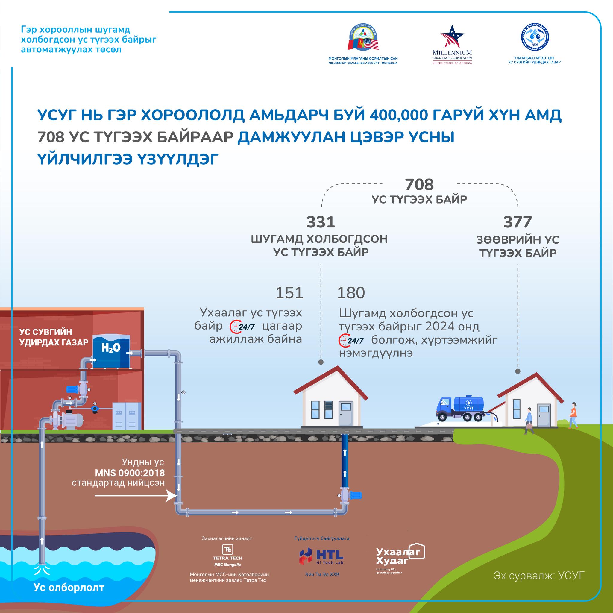 2024 оны байдлаар Улаанбаатар хотын гэр хорооллын 400 мянган иргэний тал хувь нь 24/7 ажиллагаатай 331 ухаалаг худгаас усаа авч байна. Төслийн хүрээнд гэр хорооллын ус хангамжийг сайжруулах зорилгоор 180 худгийг бүрэн автоматжуулж, УСУГ-т хүлээлгэн өгсөн юм.